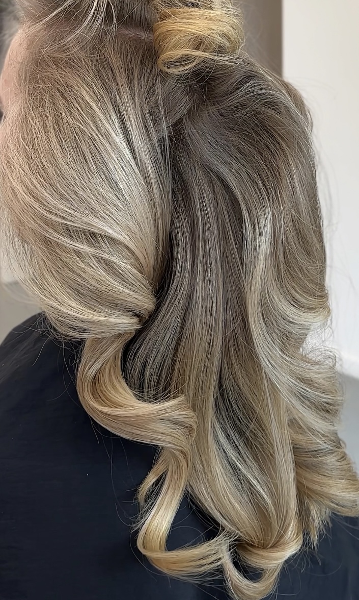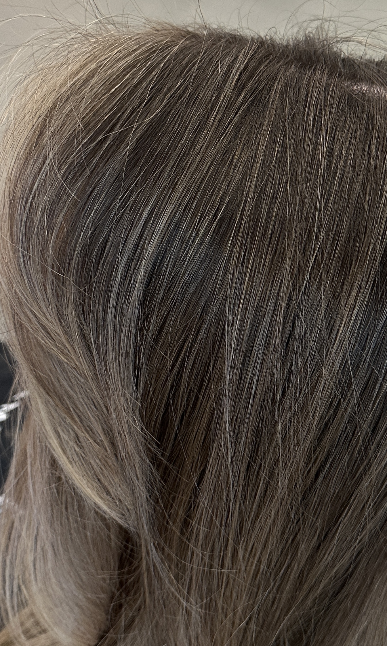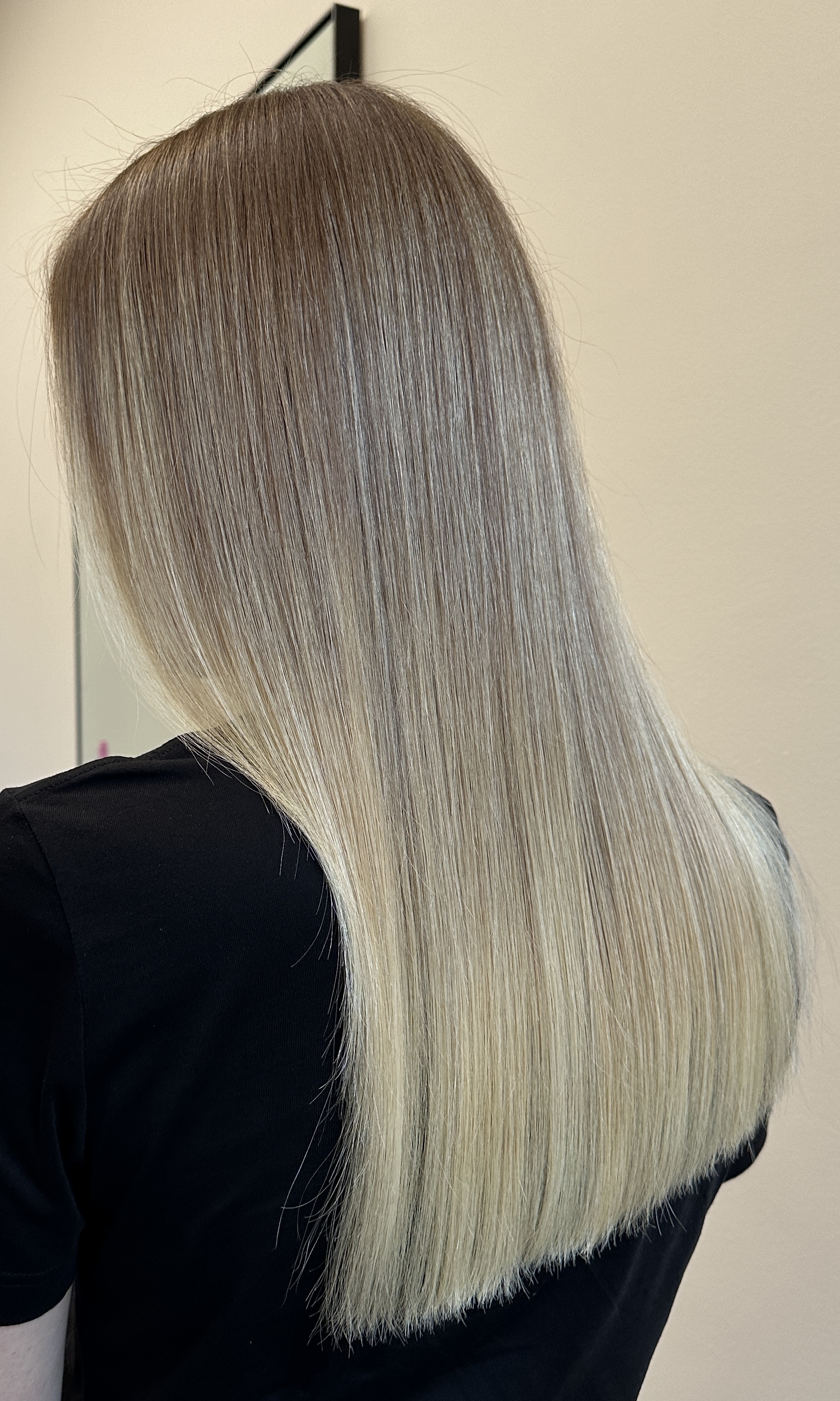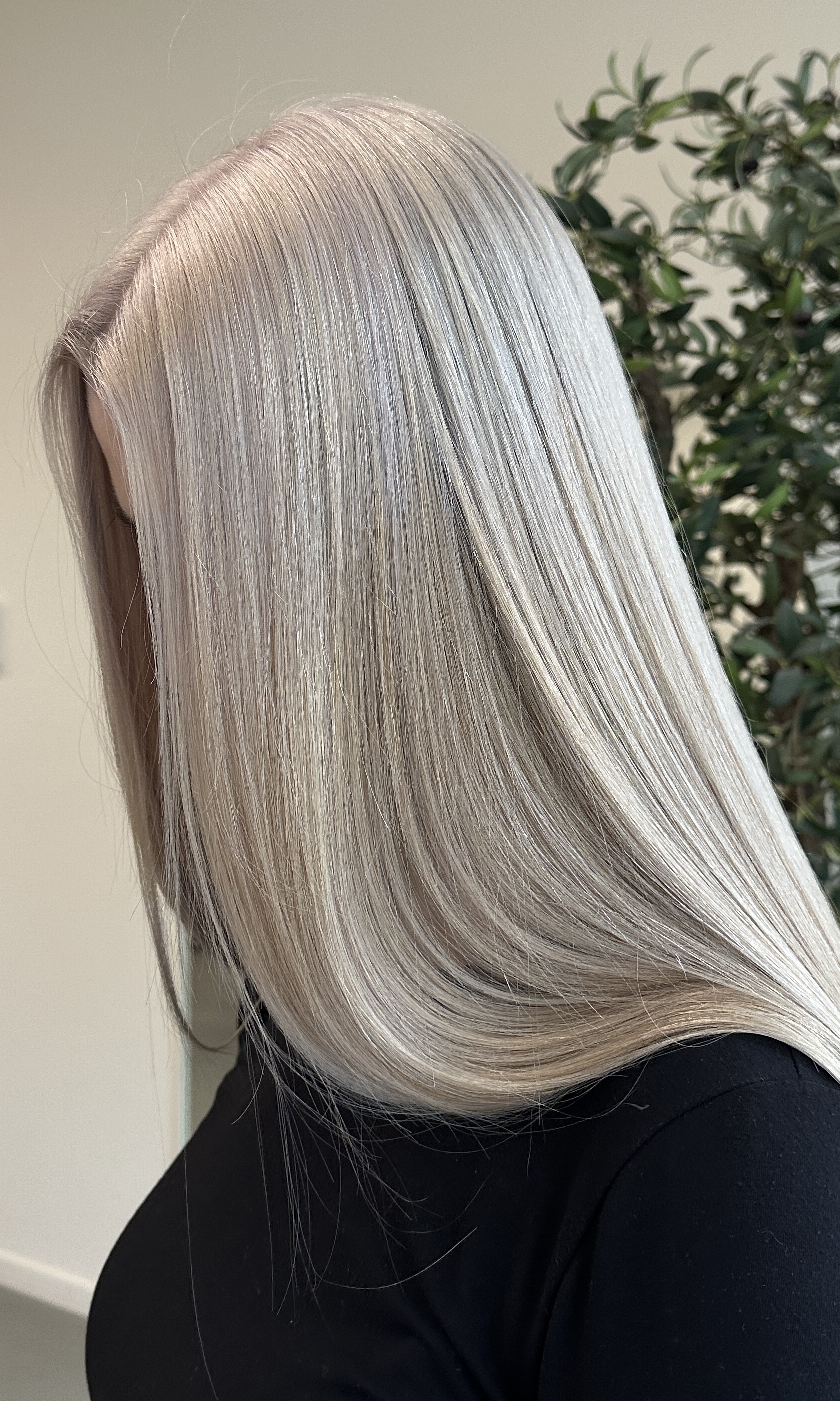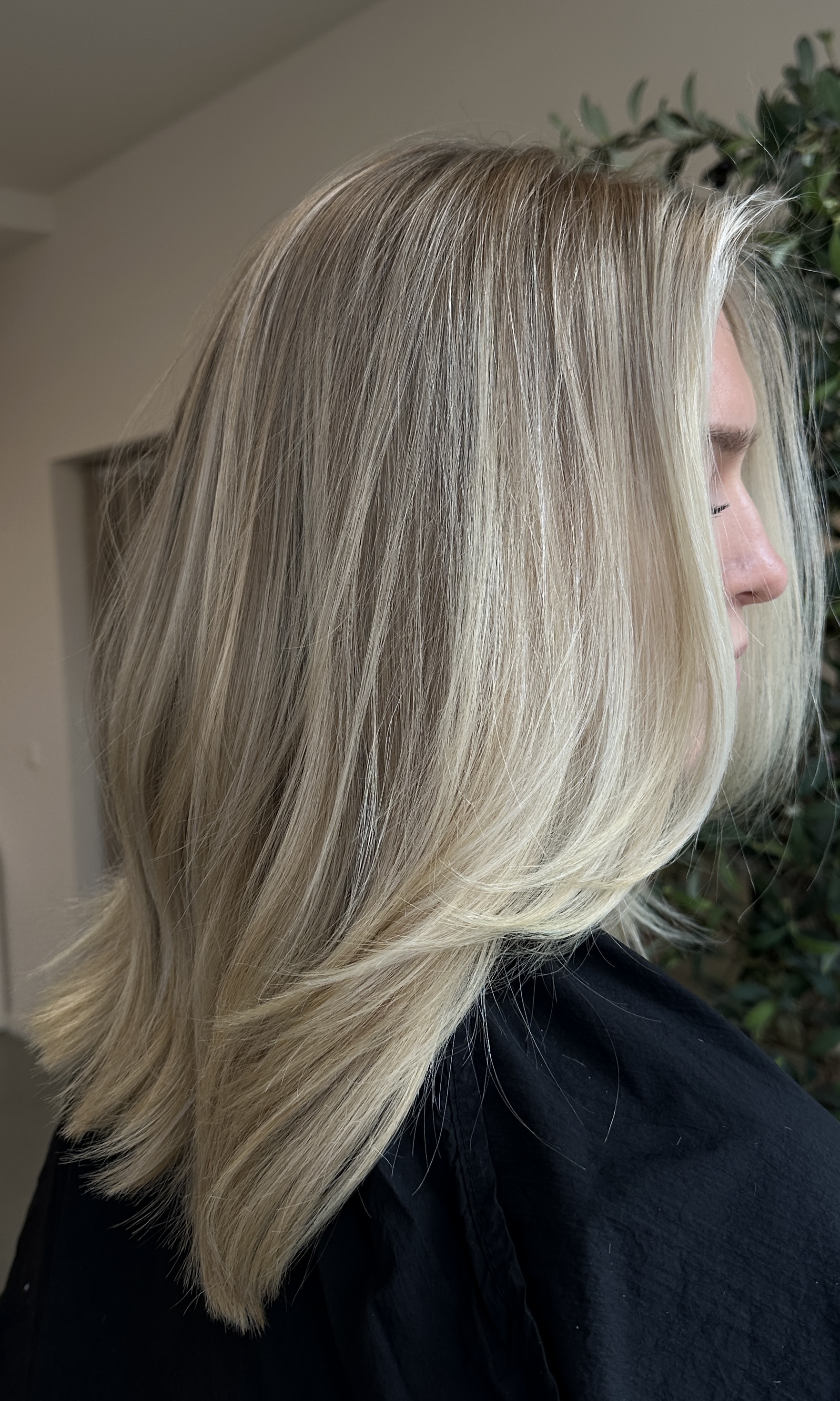 Toner (Kein Blondieren) Für Blondkundinnen, die einen natürlicheren Look mit weichen, dunkleren Ansätzen wünschen. Durch die Verblendung von Ansatzfarbe und Glossing entsteht ein harmonischer Übergang - ganz ohne Blondierung.