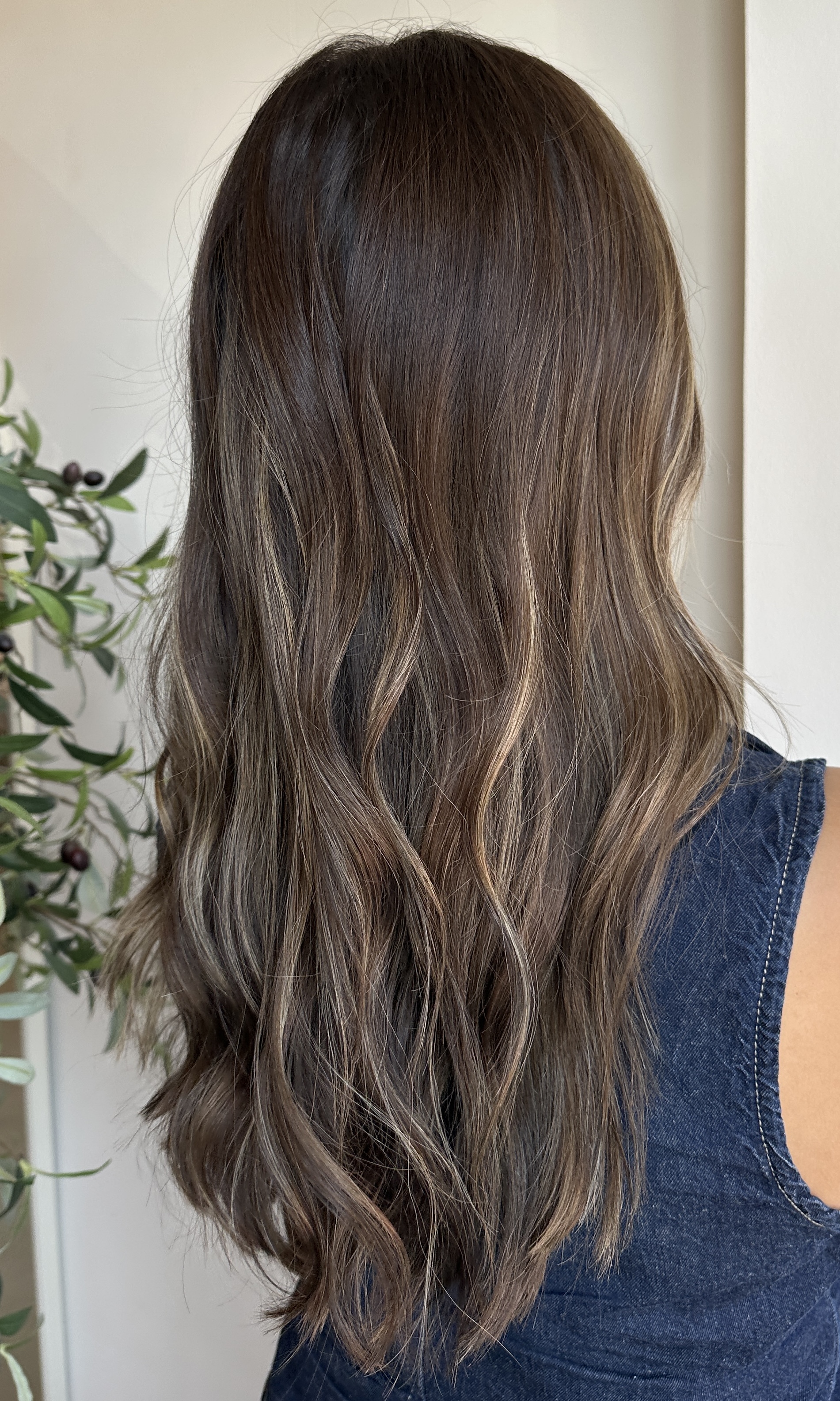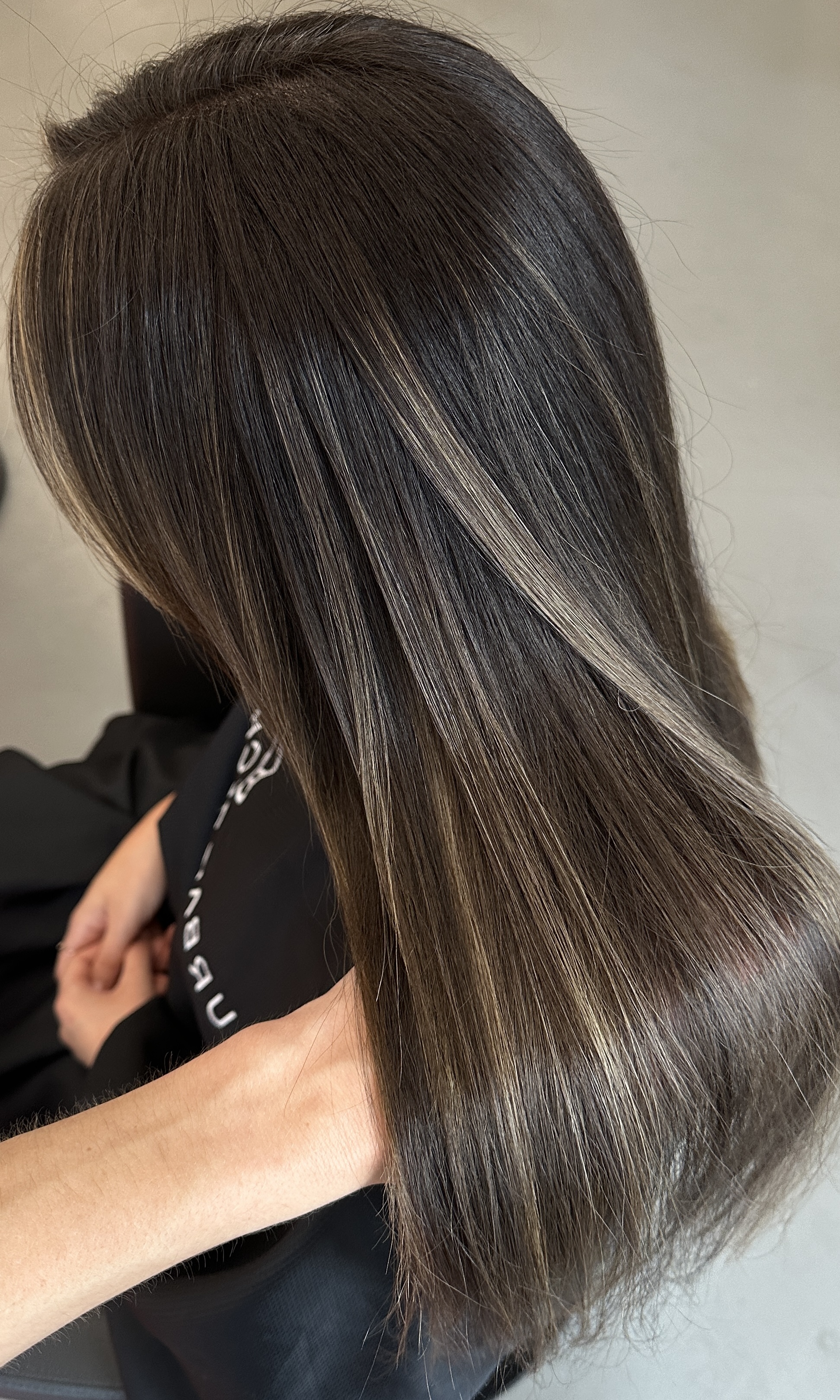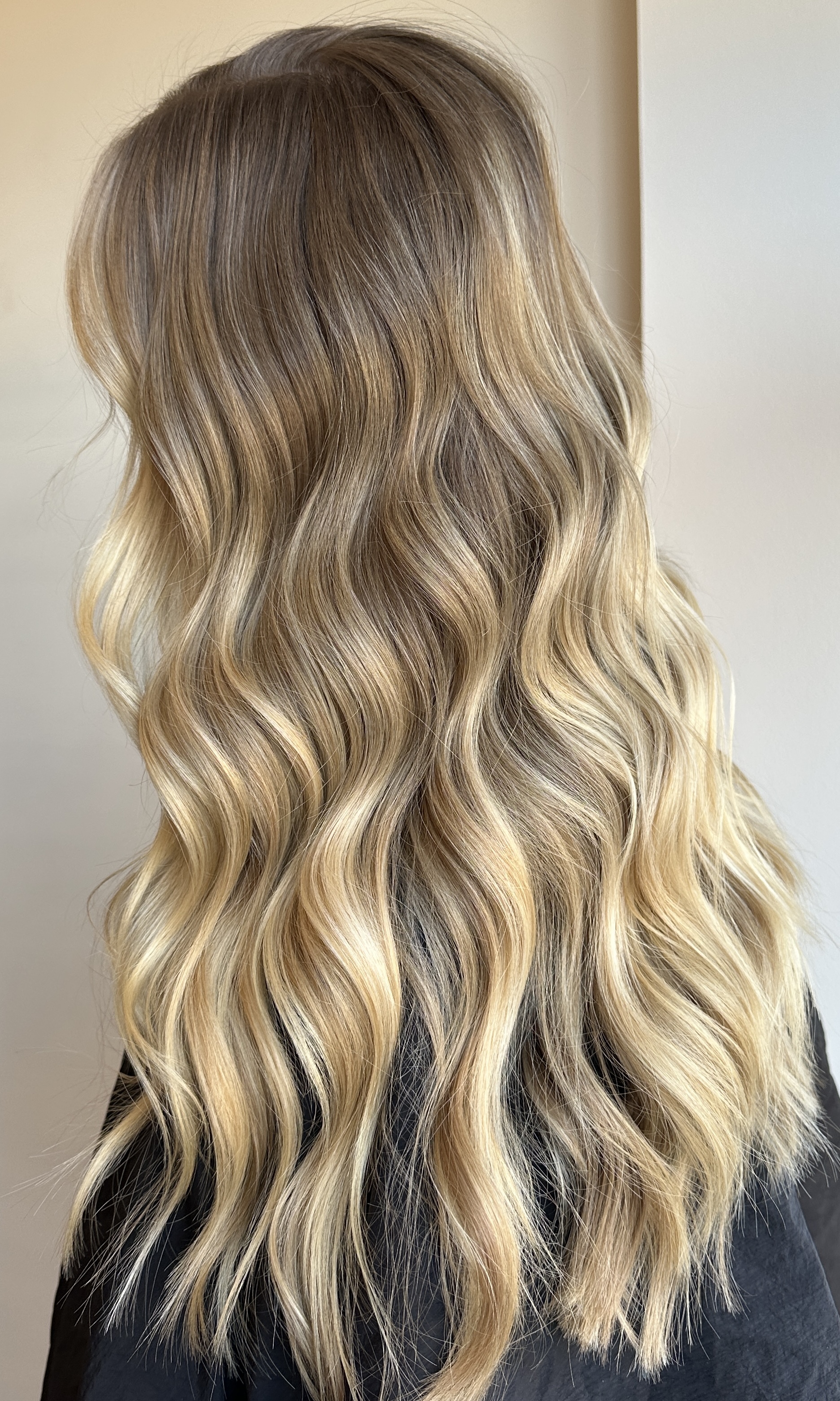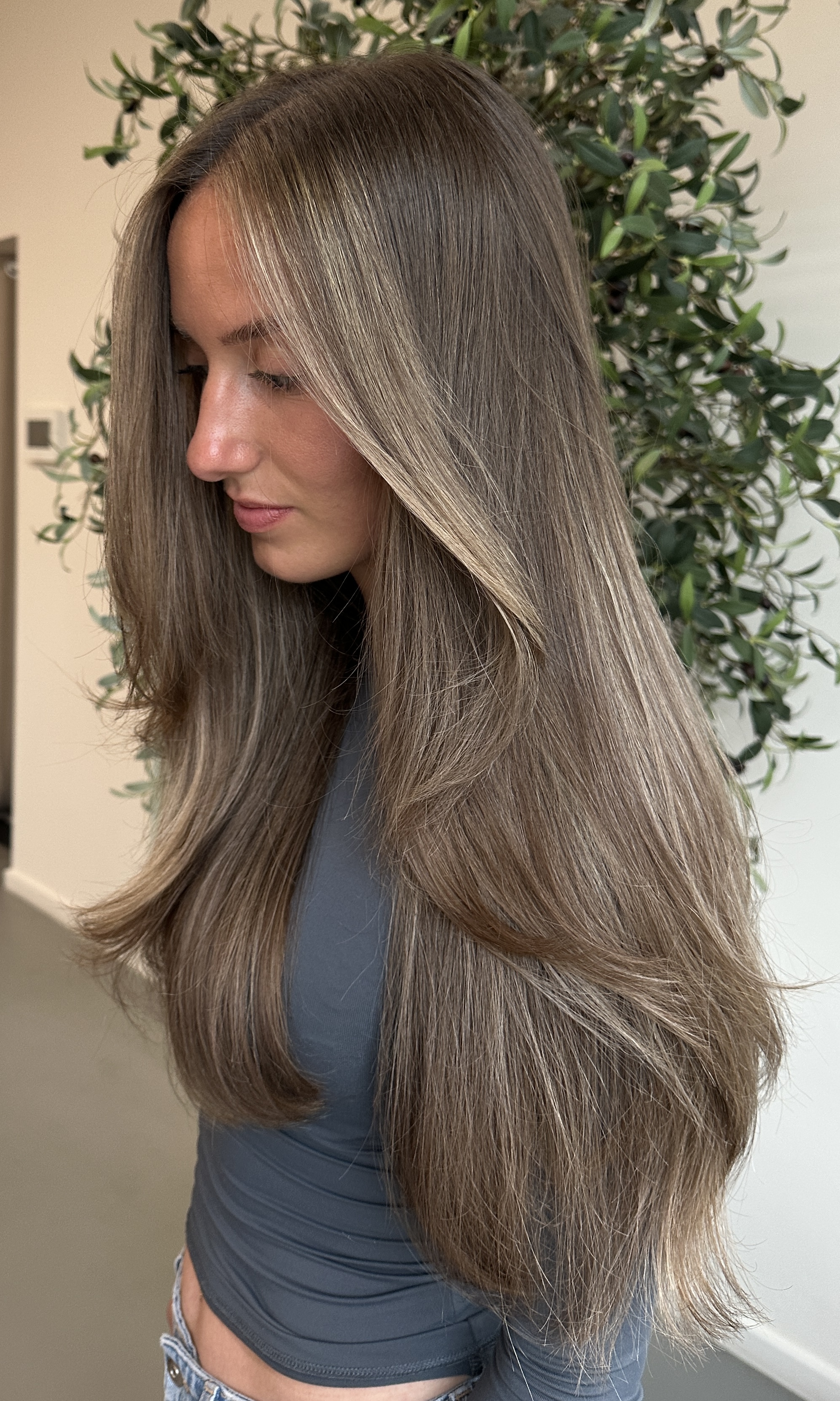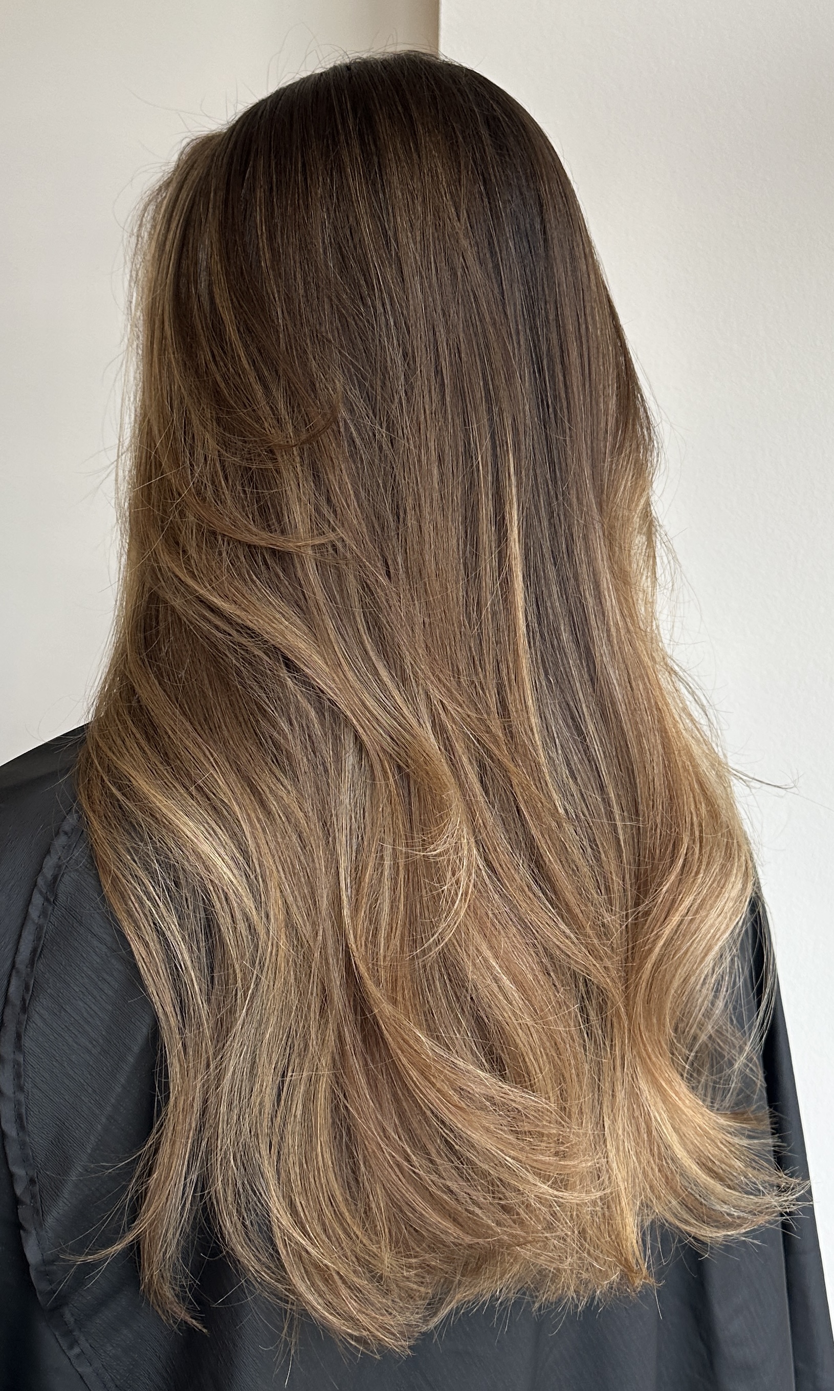 Personalisierte Strähnentechnik, die mittels Föhn- und Toupiertechnik zu feinsten Strähnen und nahtlosem Übergang vom Naturhaar bis in die Spitzen sorgt. Je nach Lichteinfall wirkst du mal heller und mal dunkler, was zu einem noch natürlicherem, aber trotzdem sehr hellem Look führen kann.